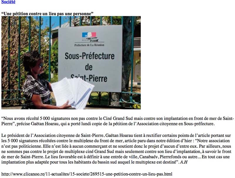 Merci encore.Le texte de la pétition présente une argumentation qui a été validée par les signataires. Les Réunionnais, et les touristes qui nous rendent visite, ont parfaitement exprimé en nombre leur opposition au lieu d’implantation du multiplexe projeté.