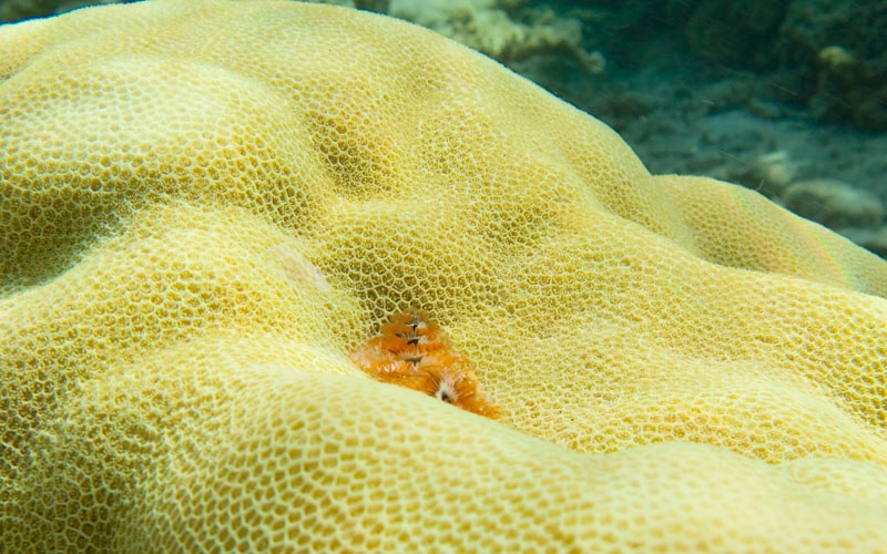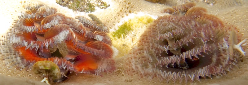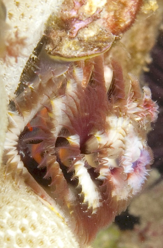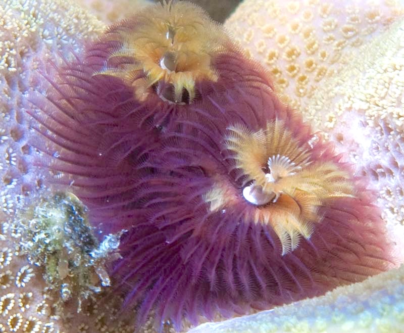 Ce ver marin vit dans les eaux tropicales peu profondes, entre 0 et 30 m de profondeur, et on le trouve dans les lagons de la Réunion. Celui présenté ici, de la famille des Serpulidés, vit dans un petit tube calcaire, implanté dans le corail massif type Porites, comme sur la photo suivante.