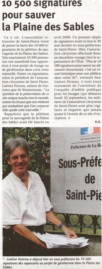 Lassociation Citoyenne de St Pierre a effectué ce jour à la Sous-préfecture un deuxième dépôt de pétitions pour la  « Sauvegarde de la Plaine des Sables » – 1100 hectares retirés du dossier de candidature de la Réunion à linscription au patrimoine mondial de lhumanité.