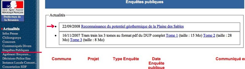 BRAVO aux services de l’ETAT et MERCI, le dossier de l’enquête publique est, dès ce mardi 23 septembre 2008, disponible sur le site internet de la Préfecture de la Réunion.