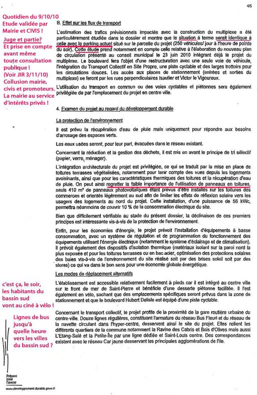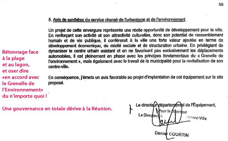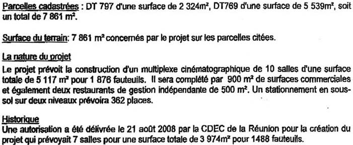 Etrange aussi. Ce multiplexe auquel s’ajoutent commerces, restaurants (donc nécessité de parkings supplémentaires ..) comporte t-il aussi un projet « missouk » d’hôtel, hôtel dont parlait un des promoteurs au JT d’Antenne Réunion le 1 mars 2009 ?