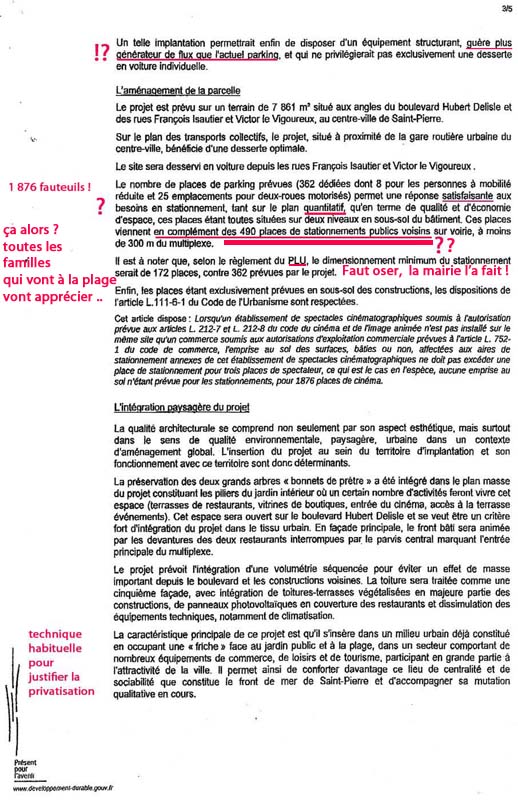 Ainsi, pour la mairie de Saint-Pierre avec son PLU, 172 places de stationnement suffiraient pour un multiplexe ENORME de 1876 fauteuils pour les 10 communes du sud + 900 m2 de commerces + 500 m2 de restaurants !!! Faut oser le dire quand même !!!
