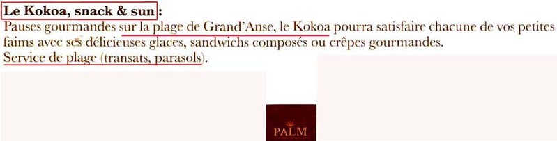 Alors qu’avant même le dépôt d’une demande de permis de construire, l’hôtel Palm faisait mention comme argument publicitaire d’un restaurant de plage nommé « Kokoa », nous apprenons ce mercredi matin 5 septembre 2007 par le service d’urbanisme de la commune de Petite-île que la demande de permis de construire n° 974 405 07A0024 Demandeur « SAS Les jardins de Grand-Anse » déposée le 5 mars 2007, aurait été refusée avec envoi de courrier au demandeur le 8 août 2007.
