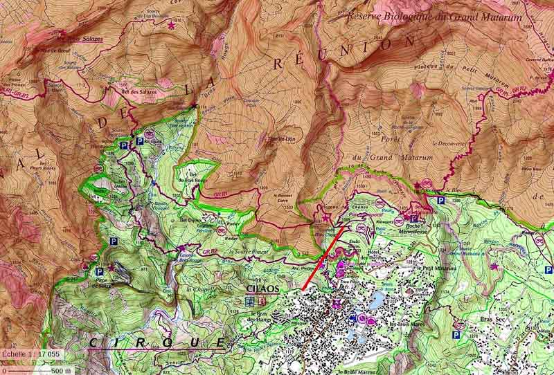 Cette tyrolienne « géante » (en rouge sur fond de carte IGN ci-dessus) traverserait le périmètre patrimonial de protection (500m autour) de l’Église de Cilaos et toute une zone naturelle réservée à la randonnée et la détente.