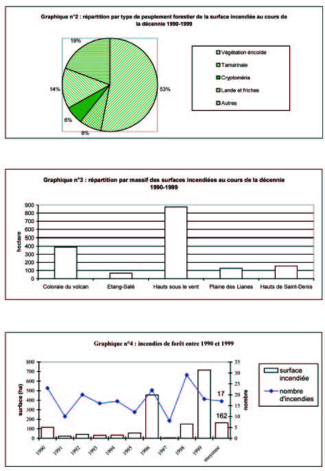 « Eu égard à la sensibilité de certaines zones (sécheresse estivale, inflammabilité de la végétation), aux phénomènes dérosion consécutifs à la perte de la couverture végétale et aux échelles de temps de reconstitution du sol et de la végétation, les incendies constituent lune des principales menaces écologiques pesant sur les écosystèmes naturels de la Réunion. Ceci justifie létablissement dun plan de protection des forêts contre les incendies et le classement de lîle en zone à risque au niveau national et européen, permettant loctroi de moyens de prévention et de lutte adaptés.