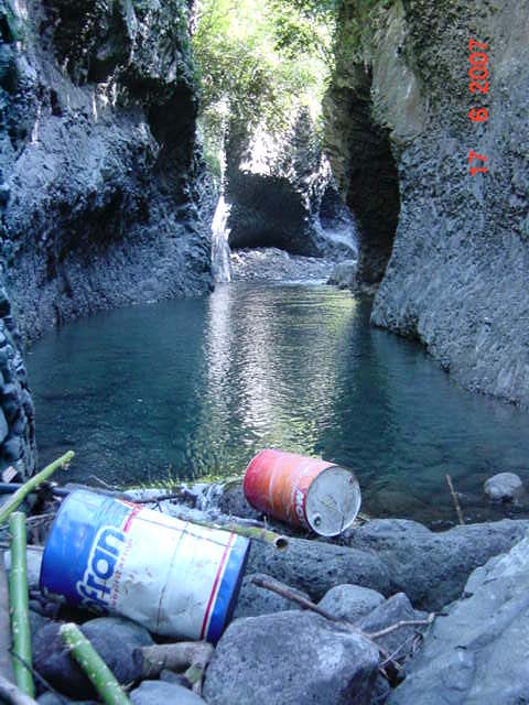 Dans les gorges du Bras de la Plaine, lit de l’ancienne piste de Bras de Pontho. Beau bassin, n’est-ce pas ? ….avec qq bidons de 200 litres (d’…..) oubliés.