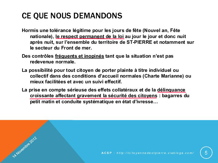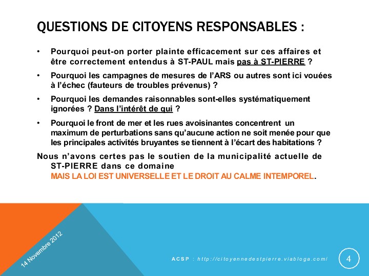 Dans un esprit de dialogue constructif, l’Association Citoyenne a été reçue par le nouveau Commissaire de Saint-Pierre M. Lionel Vançon, ce mercredi 14 novembre 2012. Le Conseil Local de Surveillance et de Prévention de la Délinquance (CLSPD) ne s’est plus réuni depuis plus d’un an, depuis le 6 juin 2011, date où nous indiquions à tous les membres du conseil notre prévision de montée de la délinquance et l’exaspération des habitants face à la plaie des nuisances sonores imposées à l’excès par la multiplicité des manifestations du week-end sur le front de mer, devenu souce de « déluges sonores » insupportables et illégaux.