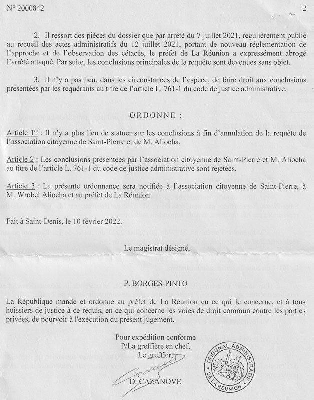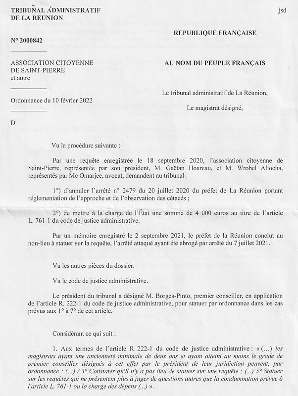 Le préfet de La Réunion a signé en 2020 un arrêté contestable, en l’occurrence l’arrêté « Cétacés-business » N°2479 du 20 juillet 2020. Nous attaquons cet arrêté en justice, au tribunal administratif, par notre requête du 18 septembre 2020.