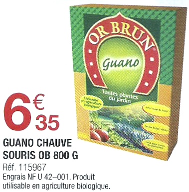 Guano de chauve-souris importé. Pub d’un revendeur local Reunion. Novembre 2015.