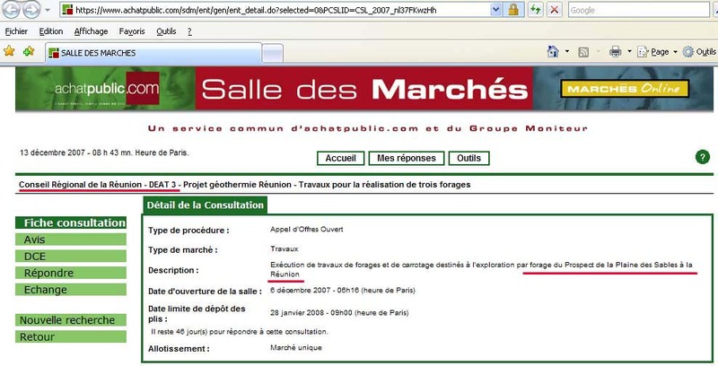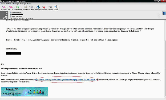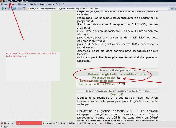 Alors quand C.Rat fait mine de ne pas comprendre ou de ne pas savoir calculer, et parle de désinformation « je ne sais pas où ils ont vu ce chiffre », il s’agit d’un mensonge conscient, ou sur ordre. Nous avons eu le souci de contacter M. Rat, fin 2007, qui nous a répondu « je ne suis pas habilité en tant qu’ARER à délivrer des informations sur le projet géothermique Réunion. » Mais il a eu l’intelligence de nous renvoyer sur la fiche géothermie de l’ARER où est pourtant bien mentionné le chiffre de 20 MW. Qui désinforme ?