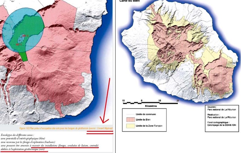 A gauche : Page 361 du Dossier de candidature UNESCO : Zone pouvant être amenée à recevoir des installations (forages, conduites de liaisons, centrale) dédiées à l’exploitation géothermique (vert) ! Cette zone va même bien au-delà de la zone ôtée du classement Patrimoine mondial, en s’étendant sur toute la Savane Cimetière !