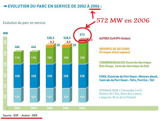 Quand C.Rat, directeur de l’ARER, jongle avec les MW comme avec des quilles, il y de quoi s’interroger. De plus, le document « Bilan énergétique 2006 à la Réunion » disponible sur le site internet de l’ARER précise, à la page 10, que la puissance électrique totale installée est de 572 MW.