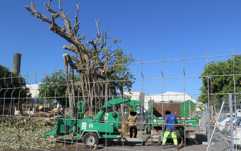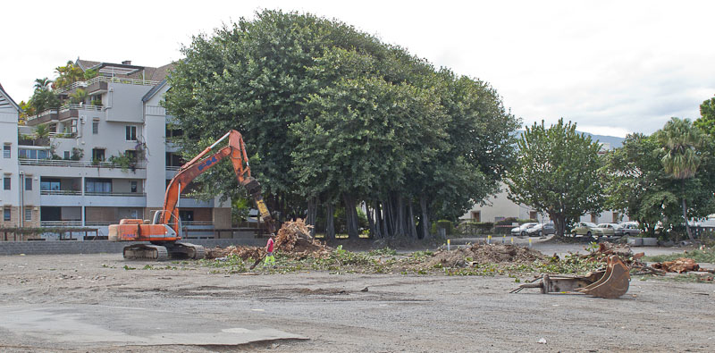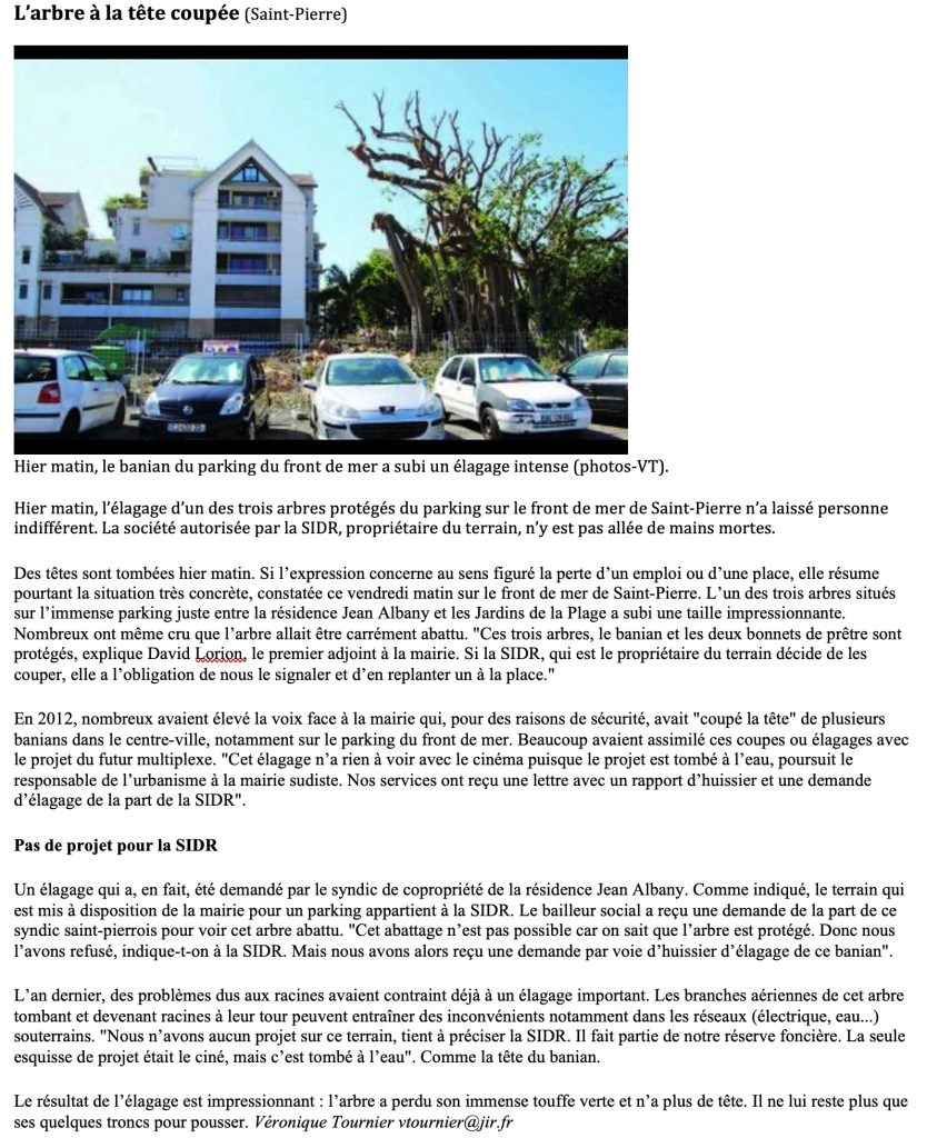 Près de 2 ans après le saccage d’autres arbres (Bonnet de prêtre (!), badamiers, filaos), fait que nous avions déjà dénoncé, la SIDR a osé lancer un abattage d’arbre pourtant classé à protéger sur ce terrain du front de mer de Saint-Pierre, terrain sur lequel un promoteur (qui faisait partie du conseil d’administration de la SIDR ..) souhaite réaliser un multiplexe contesté par un bonne part de la population, le lieu n’étant pas adapté.
