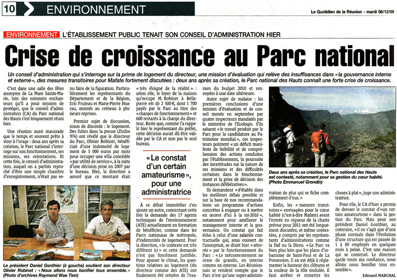 La presse a rendu compte ces dernières semaines des nouveaux dérapages dans l’action et les projets du parc national de la Reunion: