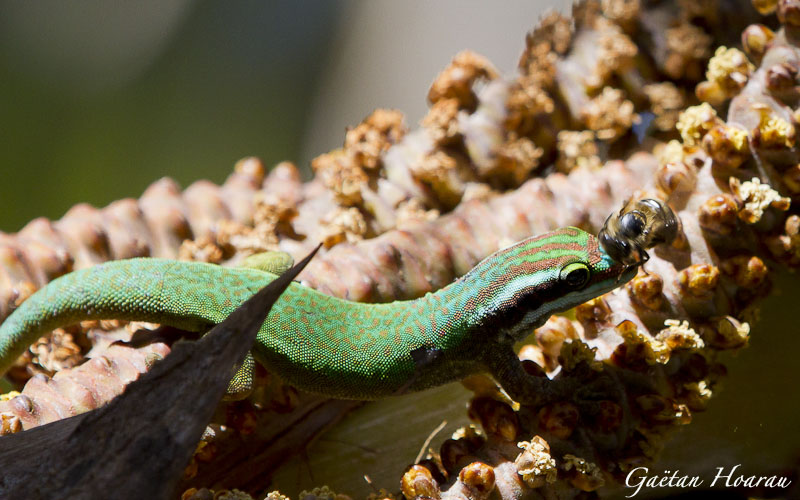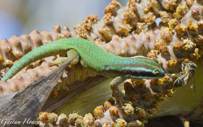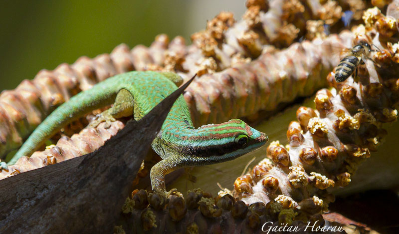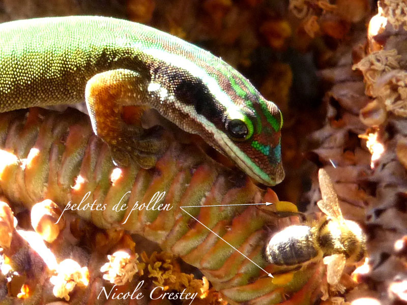 Phelsuma inexpectata attiré par la pelote de pollen d’une abeille.