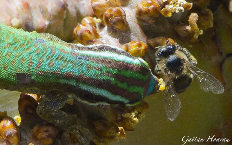 On pourrait penser à priori qu’ils vont capturer et consommer ces abeilles bien occupées à butiner, comme mentionné dans des documents tels le Plan national d’actions 2012-2016 élaboré en faveur de la protection de ce gecko vert. Eh bien, pas du tout !
