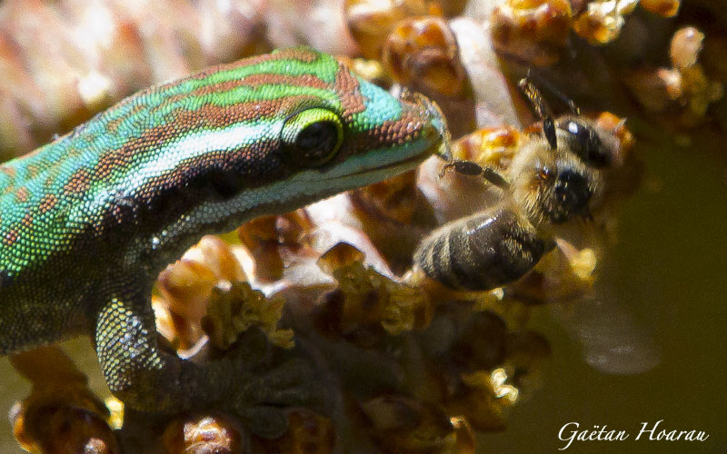 A l’affût, les Phelsuma s’approchent subrepticement d’un côté de l’abeille, sautent sur la pelote jaune de pollen et la saisissent vivement dans leur gueule, avant de l’avaler. Tout ceci se déroule si rapidement qu’il est difficile de l’observer à l’oeil nu. L’abeille dépossédée ne peut que s’envoler à la suite de ce larcin.