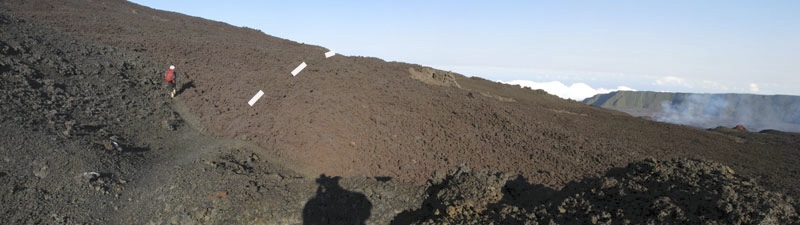 Cratère (servant de belvédère) à longer (nos gros traits blancs en bas du cratère), et on retrouve le balisage ensuite