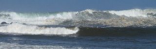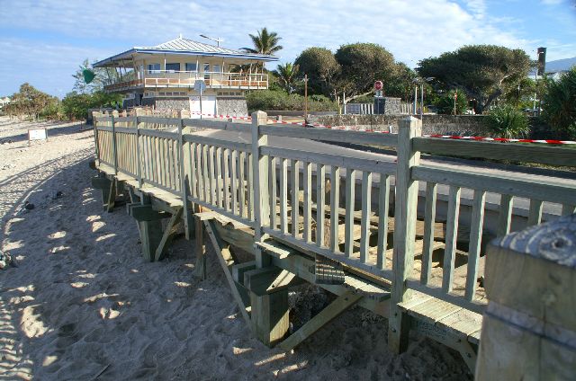 Le ponton était installé sur pilotis.Le train de houle forcément méchant, a traversé à toute vitesse la plage pour se heurter au mur de soutènement de la chaussée, à droite. L’eau taclée par plus fort qu’elle, est partie à la verticale où elle n’a trouvé qu’un plancher en bois.