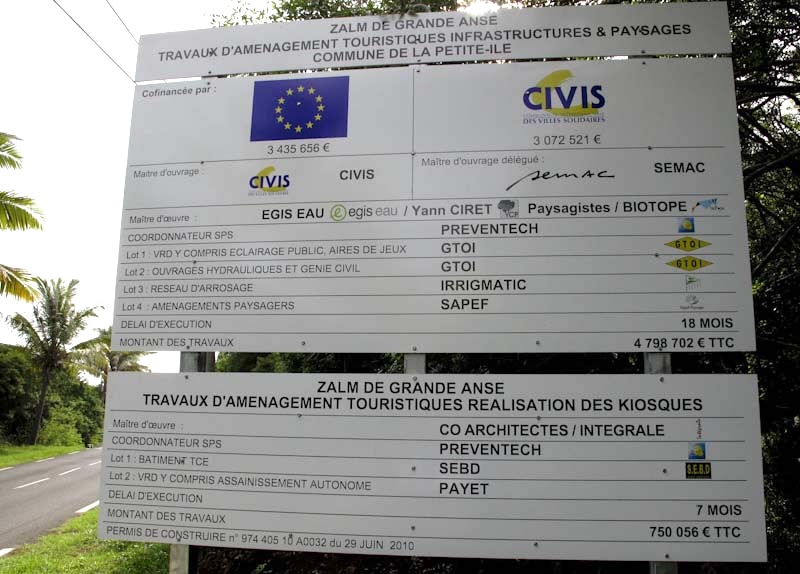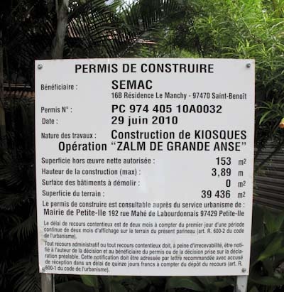 Comme tout le monde a pu le constater, la civis a démarré les travaux sur le site de Grand-Anse, bien avant la fin de la période susceptible de recours des 2 mois d’affichage des panneaux de permis de construire sur site. Contactées, ni la mairie de Petite-Ile, ni la SEMAC, ni la civis ne veulent fournir le certificat d’affichage des panneaux. Un véritable mépris des procédures publiques réglementaires.