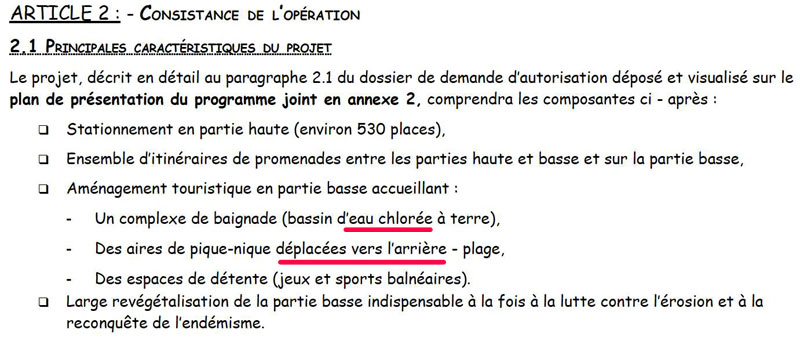 Le projet validé par l’arrêté présente entre autres, une hérésie écologique et économique, la piscine en eau chlorée, et il spécifiait bien la construction de 2 rondavelles en remplacement des 2 camions-bar existants. Vous remarquerez que désormais ceci a été doublé, 4 structures supplémentaires en plus de la rondavelle existante.