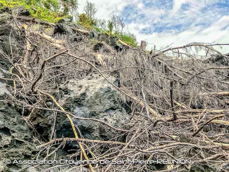 Pourtant, il suffit d’aller sur site pour constater l’étendue des dégâts au niveau des falaises, notamment l’amoncellement de déchets de coupe sur les terriers, ce qui prouve qu’il s’agit bien dune élimination systématique des filaos dans la zone de reproduction des puffins, et des travaux ont lieu aussi en saison de reproduction. C’est ce que nous avons indiqué à la BNOI par mail et téléphone, BNOI à qui nous avons demandé le constat sur place étant donné qu’il n’y a pas nécessité absolue d’éliminer tous les filaos dans et en bas de falaise.
